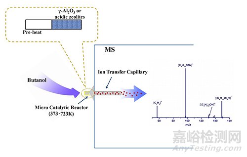 陽離子物種被認為是醇類脫水等異相催化反應過程中的重要中間體,但是由于其壽命短、活性高、濃度低、組成復雜,長期以來缺少可以直接進行高通量全面分析的技術手段。針對此問題,該研究團隊在靜電場軌道阱質譜離子入口處集成了催化反應微型反應器,醇類反應物在加熱和真空條件下快速氣化,通過固相催化劑(三氧化二鋁或分子篩)后直接進入質譜系統(tǒng)進行檢測,極大縮短了陽離子物種進入質譜檢測的時間。同時,由于高分辨質譜的使用,可以通過精確分子量直接確定陽離子的元素組成。
