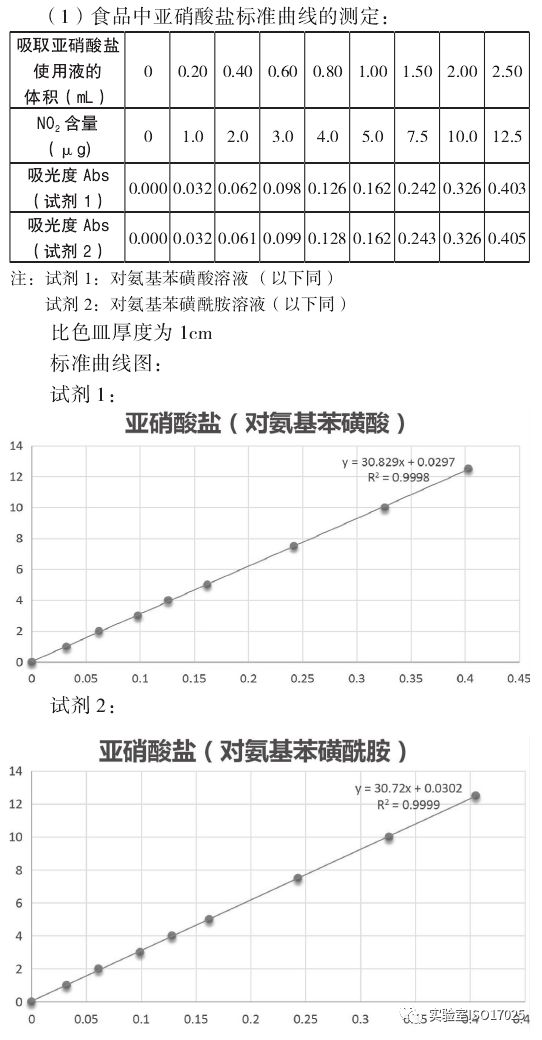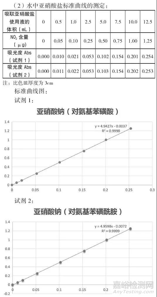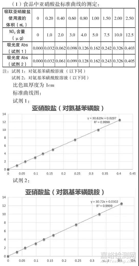(3)可以用一種試劑(對氨基苯磺酸或者對氨基苯磺酞胺)進(jìn)行食品中亞硝酸鹽的測定和水中亞硝酸鹽的測定,不必同時配制兩種試劑,不影響檢驗結(jié)果。