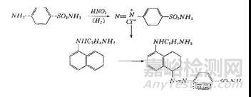 (1)理論上,對氨基苯磺酸和對氨基苯磺酞胺都是在酸性條件下,亞硝酸鹽與對氨基苯磺酸重氮后,再與鹽酸萘乙二胺偶合形成紫紅色染料,比色定量,得出樣品的亞硝酸鹽含量。