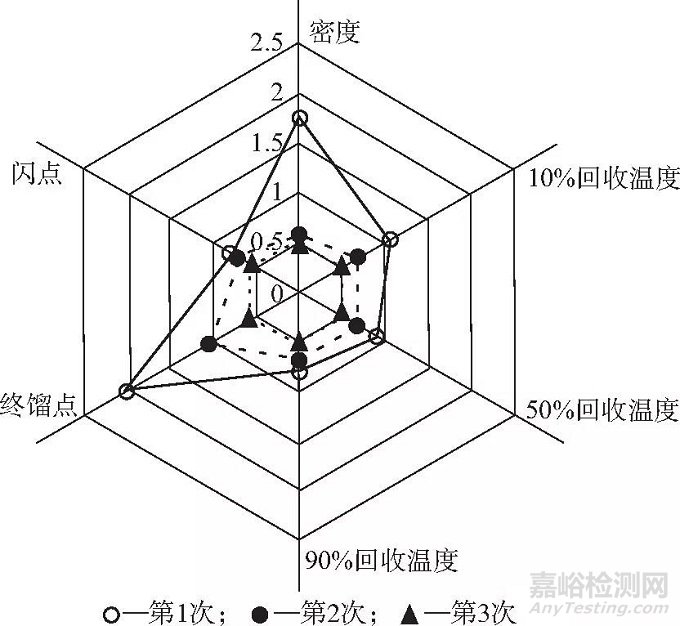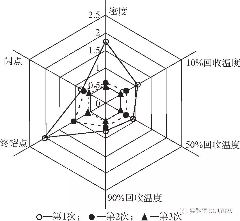 利用異方差t檢驗(yàn)對不同檢測方法獲得的結(jié)果進(jìn)行比較, 證實(shí)了密度計(jì)法和U型振動(dòng)管法密度檢測結(jié)果無顯著差異, 但U型振動(dòng)管法的檢測精密度優(yōu)于密度計(jì)法;在閃點(diǎn)測試中, 賓斯基–馬丁閉口杯法測定結(jié)果高于泰格閉口杯法。通過比較能力驗(yàn)證評價(jià)標(biāo)準(zhǔn)差和檢測標(biāo)準(zhǔn)的精密度要求, 證實(shí)了參加實(shí)驗(yàn)室對密度和終餾點(diǎn)的檢測能力優(yōu)于標(biāo)準(zhǔn)要求, 對10%, 50%回收溫度和閃點(diǎn)的檢測能力能夠滿足檢測標(biāo)準(zhǔn)要求, 對90%回收溫度檢測能力不能滿足標(biāo)準(zhǔn)要求。研究表明, 能力驗(yàn)證數(shù)據(jù)能夠用于定性分析參加實(shí)驗(yàn)室的整體檢測能力, 為行業(yè)實(shí)驗(yàn)室監(jiān)管和檢測方法間比對提供依據(jù)。能力驗(yàn)證對改進(jìn)實(shí)驗(yàn)室檢測能力有很大幫助, 能夠顯著提高實(shí)驗(yàn)室檢測結(jié)果的可靠性。