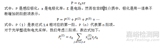 寬帶太赫茲也可以由非線性光學(xué)晶體材料產(chǎn)生及探測(cè)。在線性光學(xué)中,介質(zhì)的極化與電場(chǎng)存在線性關(guān)系如下: