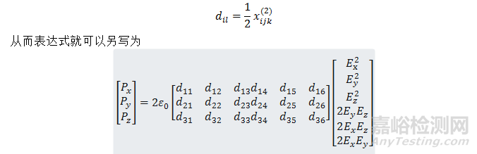 式中:I,j,k分別對(duì)應(yīng)笛卡爾坐標(biāo)軸的x,y,z,需要27個(gè)元素。然而,由于晶體對(duì)稱性的影響,元素?cái)?shù)量減為18個(gè),并且在多種晶體中,元素?cái)?shù)量減少得更多,因?yàn)楹芏嘣貫榱?。這18個(gè)元素張量通常被寫成一個(gè)d矩陣: