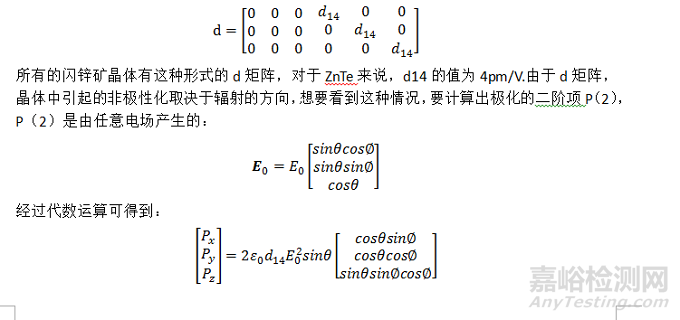有幾種非線性晶體已經(jīng)被用作產(chǎn)生和探測(cè)太赫茲輻射,例如GaAs、GaP、InP、GaSe、LiNbO3和LiTaO3,然而,最常用的晶體是ZnTe(碲化鋅),這種晶體材料d矩陣的形式非常簡(jiǎn)單: