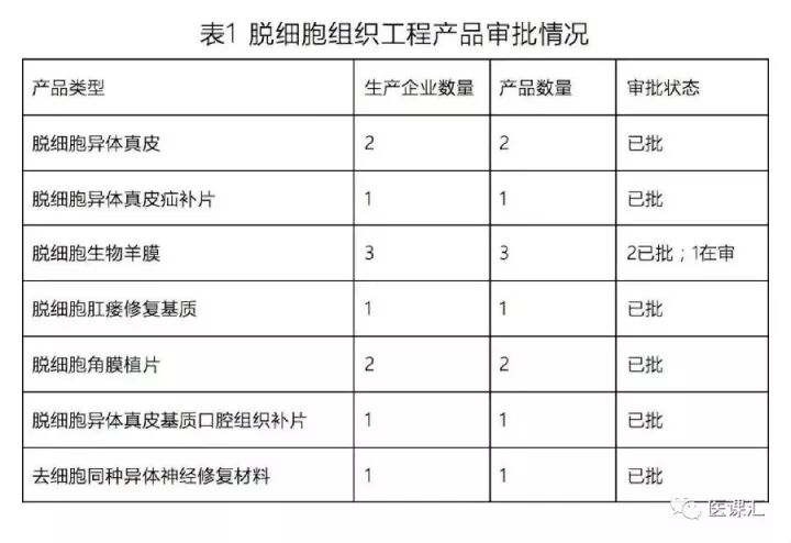 我國(guó)目前審評(píng)審批的脫細(xì)胞組織工程產(chǎn)品情況如表1所示: