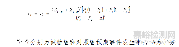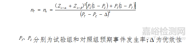 當(dāng)試驗(yàn)組和對照組按照1:1隨機(jī)化分組,主要評價(jià)指標(biāo)為事件發(fā)生率,其樣本量估算公式為: