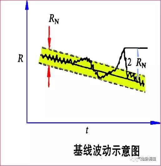 當(dāng)檢測(cè)器輸出信號(hào)放大時(shí),電子線路中固有的噪聲同時(shí)也被放大,使基線波動(dòng),如下圖所示。取基線起伏的平均值為噪聲的平均值,用符號(hào)RN表示。由于噪聲會(huì)影響測(cè)量試樣色譜峰的認(rèn)辨,所以在評(píng)價(jià)檢測(cè)器的質(zhì)量時(shí)提出了檢出限這一指標(biāo)。