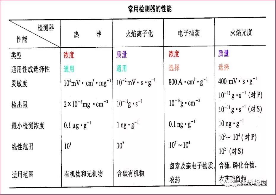 判斷一臺(tái)氣相色譜儀的好壞。檢測(cè)器的性能是重要的方面。一個(gè)優(yōu)良的檢測(cè)器應(yīng)具以下幾個(gè)性能指標(biāo):靈敏度高,檢出限低,死體積小,響應(yīng)迅速,線性范圍寬,穩(wěn)定性好。通用性檢測(cè)器要求適用范圍廣;選擇性檢測(cè)器要求選擇性好。下圖列出四種常用檢測(cè)器的性能指標(biāo)。