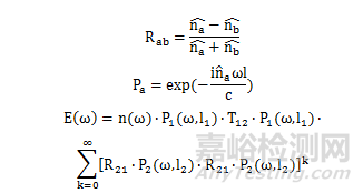 這是太赫茲波穿過空氣的電場表達(dá)式,其中空氣是材料1,大塊兒樣品是材料2,然后又是空氣,最后到達(dá)探測天線,此處 ,空氣中的傳播長度是l1,從發(fā)射器到樣品和樣品到探測器的距離是一樣的,在樣品中傳播的 距離是l2,求和表示,樣品內(nèi)部的內(nèi)反射為了簡化分析,略去求和,為了提取系統(tǒng)的傳遞函數(shù),我們可以用只在空氣中傳播的電場作為參考,傳遞函數(shù)包括樣品的標(biāo)準(zhǔn)具效應(yīng):