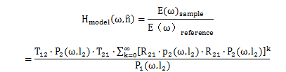 傳遞函數(shù)是帶樣品測量和無樣品測量的比值,通常叫做參考掃描,因?yàn)橄到y(tǒng)中所有部分在有無樣品測試前后都保持一致,所以能抵消影響,因此相干的比率和樣品掃描只揭示了樣品的傳遞函數(shù)。可以通過對比材料的實(shí)驗(yàn)傳遞函數(shù)和理論傳遞函數(shù)得到復(fù)折射率,兩種傳遞函數(shù)都取決于復(fù)折射率。為了獲取理論傳遞函數(shù),通常采用菲涅爾系數(shù)和傳播的一般形式,通過材料的電場傳播建模: