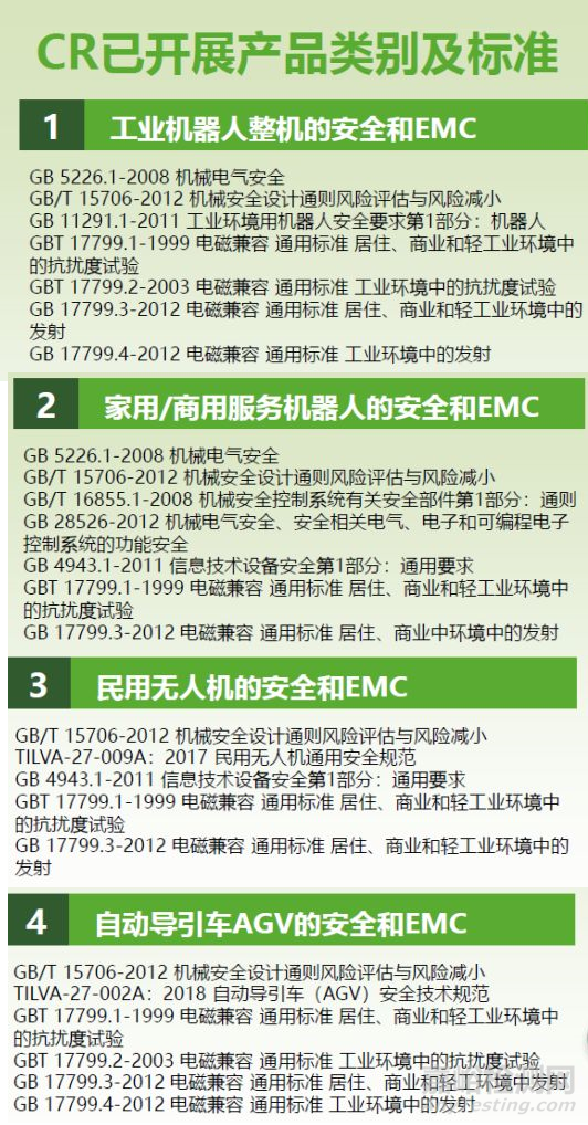 目前,CR已開展產(chǎn)品類別及標準包括工業(yè)機器人整機的安全和EMC標準認證、家用/商用服務(wù)機器人的安全和EMC、民用無人機的安全和EMC、自動導引車AGV的安全和EMC。