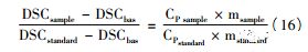 DSCsample、DSCbas、DSCstandard分別為樣品、空白(做基線)樣品和標(biāo)準(zhǔn)樣品(藍(lán)寶石) 的DSC曲線信號(hào)的縱坐標(biāo)熱焓對(duì)時(shí)間的變化率,DSCsample-DSCbas 表示樣品扣除基線后的DSC曲線信號(hào),DSCstandard-DSCbas表示標(biāo)準(zhǔn)樣品扣除基線后的DSC曲線信號(hào); Cp(sample)和Cp(standard)是樣品和標(biāo)準(zhǔn)樣品的比熱; msample和mstandard是樣品和標(biāo)準(zhǔn)樣品的質(zhì)量。