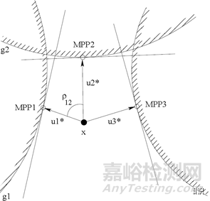從幾何上看,ρij的意義是兩個(gè)近似極限狀態(tài)切平面的法向量夾角的余弦,如圖1所示。因此當(dāng)兩個(gè)近似極限狀態(tài)切平面互相垂直時(shí),ρij=0,兩個(gè)故障模式可視為獨(dú)立。當(dāng)兩個(gè)近似極限狀態(tài)切平面平行時(shí),兩個(gè)故障模式相關(guān)系數(shù)為1。