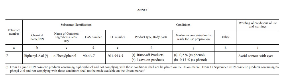 2018年11月26日,歐盟公布了歐盟化妝品法規(guī)1223/2009修訂案2018/1847號,修訂了附錄V中關(guān)于鄰苯基苯酚規(guī)定的相關(guān)條款。修訂后的規(guī)定:苯基苯酚及其鹽類在化妝品中用作防腐劑,但最大濃度在停留類和沖洗類化妝品中分別為0.15%(以苯酚計)和0.2%(以苯酚計)。 此外,應(yīng)在標(biāo)簽上標(biāo)示警示語“避免與眼睛接觸”。不允許使用鄰苯基苯酚鈉,鄰苯基苯酚鉀和鄰苯基苯酚MEA作為防腐劑。