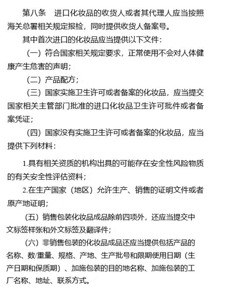 “(一)國家實(shí)施衛(wèi)生許可的化妝品,應(yīng)當(dāng)取得國家相關(guān)主管部門批準(zhǔn)的進(jìn)口化妝品衛(wèi)生許可批件,海關(guān)對進(jìn)口化妝品衛(wèi)生許可批件電子數(shù)據(jù)進(jìn)行系統(tǒng)自動比對驗(yàn)核;