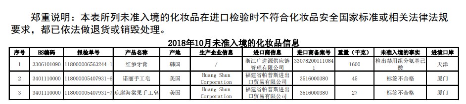 2018年10月,全國海關(guān)在入境貨物到達(dá)口岸接受監(jiān)管環(huán)節(jié),檢出安全項(xiàng)目不合格并未準(zhǔn)入境的化妝品3批。未準(zhǔn)入境的化妝品來自2個國家或地區(qū),均分別為化妝品原料和發(fā)用化妝品檢出標(biāo)簽不合格和禁限用物質(zhì)。對以上未準(zhǔn)入境的食品化妝品均已在口岸退運(yùn)或銷毀。