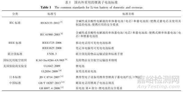 目前,國內(nèi)外常用的鋰離子電池標準列表歸納于表1。