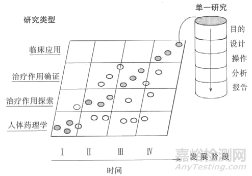 3.1.3 臨床研究的分期臨床藥物研發(fā)常被分為四個時間周期(I 期~IV 期)。應(yīng)該指出的是分期的概念并不能為臨床試驗的分類提供足夠的根據(jù)因為一類試驗可能發(fā)生在幾個分期中(圖 1)。根據(jù)研究目的分類系統(tǒng)較為優(yōu)越,這將在 2.2 節(jié)中討論。應(yīng)明確分期的概念僅是一種描述,而不是必需的模式。研究分期的概念并不意味著研究必須按照固定的順序進行,因為對于某些藥物來說,按照典型的順序進行的研發(fā)計劃是不適宜或者不必要的。例如,盡管人體藥理學(xué)研究一般是在I 期進行,但在其他III 期中也常進行很多此類研究,有時仍會被歸入I 期研究。圖1 顯示了這兩種分類系統(tǒng)間緊密而多變的聯(lián)系。圖中各點的分布說明研究類型并非研發(fā)分期的同義語。藥物研發(fā)理論上是一個有邏輯、有步驟的過程,在這一過程中,早期小規(guī)模研究獲得的信息用于支持規(guī)模更大、目的性更強的后續(xù)研究。為了有效地研發(fā)新藥,在研發(fā)早期必須確定研究藥物的特性并據(jù)此制定適宜的研發(fā)計劃。初始研究對短期安全性和耐受性進行早期評價,提供藥效學(xué)和藥物動力學(xué)信息,這些信息可為初始探索性治療試驗選擇合適的劑量范