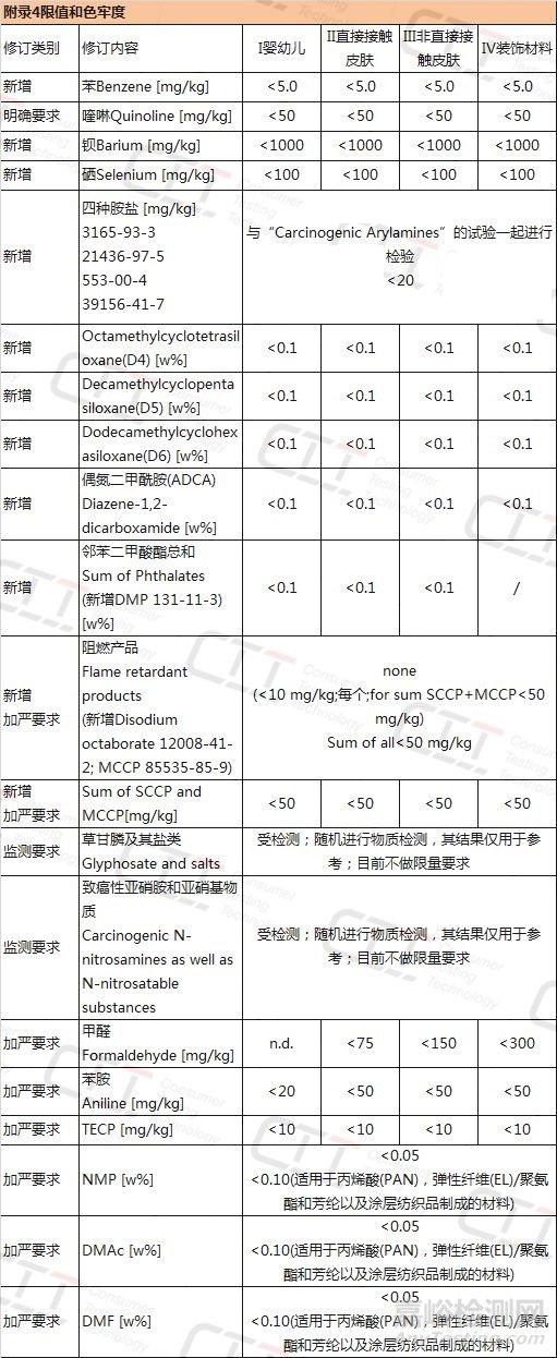 在STANDARD 100 by OEKO-TEX®附錄4中,對阻燃劑產品、甲醛、苯胺、TECP、NMP、DMAc、DMF提出更嚴格的限量值要求。