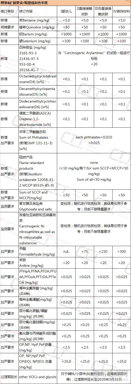 在STANDARD 100 by OEKO-TEX®附錄6中,對甲醛、苯胺、鄰苯二甲酸酯(增塑劑)、烷基酚和烷基酚聚氧乙烯醚以及全氟和多氟化合物提出更嚴格的限量值要求。