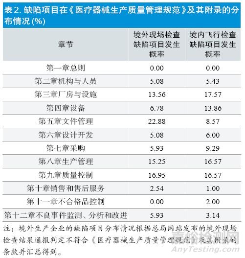 境內外檢查結果的缺陷項目在《醫(yī)療器械生產質量管理規(guī)范》及其附錄的分布趨勢基本一致,主要分布在廠房與設施、設備、文件管理、采購、生產管理、質量控制等章節(jié)。但缺陷項目在各章節(jié)的發(fā)生概率略有區(qū)別,在境外生產企業(yè)主要集中在文件管理、質量控制和生產管理部分,而在境內生產企業(yè)則在廠房與設施、質量控制和生產管理部分。見表2。