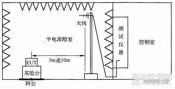 a)30MHz-1GHz電場輻射:在半電波暗室中進行,EUT隨轉(zhuǎn)臺360度轉(zhuǎn)動,天線在1-4m高度