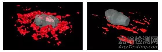 自動(dòng)掃描三維光聲/超聲雙模成像設(shè)備呈現(xiàn)的三維乳腺腫瘤畫面,左:惡性腫瘤;右:良性病變