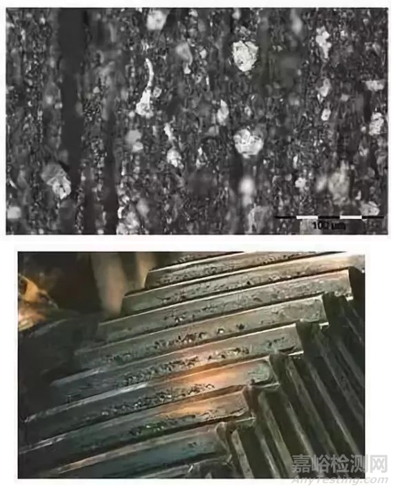 上圖:金屬疲勞; 下圖:金屬表面磨損形成的麻坑
