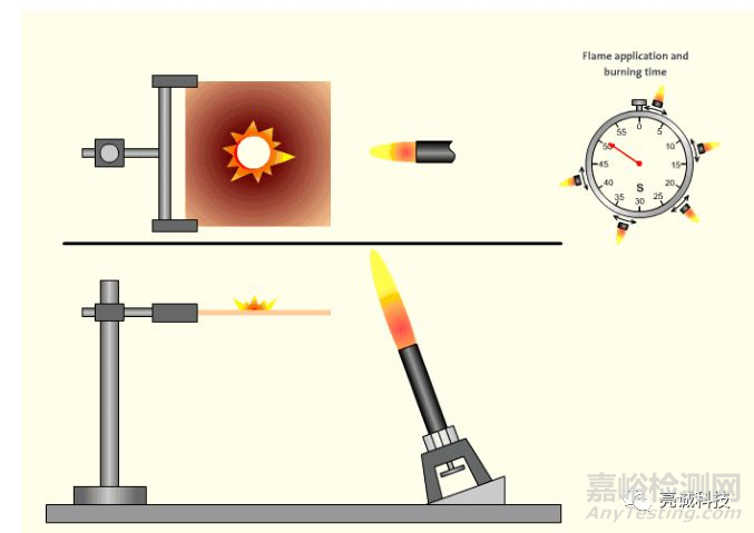 將本生燈保持與水平成20°角移動(dòng)到試片旁。使火焰內(nèi)焰尖端接觸樣品低端一邊。燃燒5秒后,移開本生燈,5秒后再燒,重復(fù)5次后記錄火焰燃燒和熄滅時(shí)間。