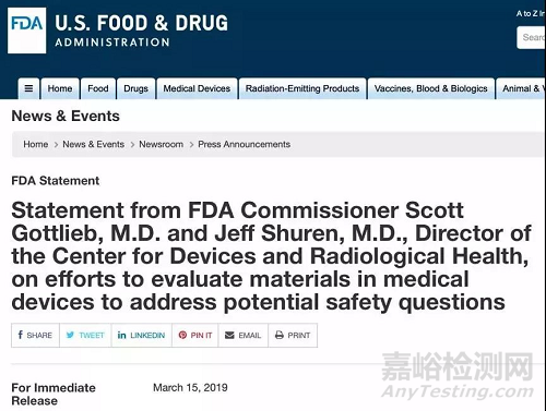 (截圖來源:FDA官網(wǎng)—FDA專員、醫(yī)學(xué)博士Scott Gottlieb和設(shè)備與放射健康中心主任Jeff Shuren關(guān)于評估醫(yī)療器械材料以解決潛在安全問題的聲明)