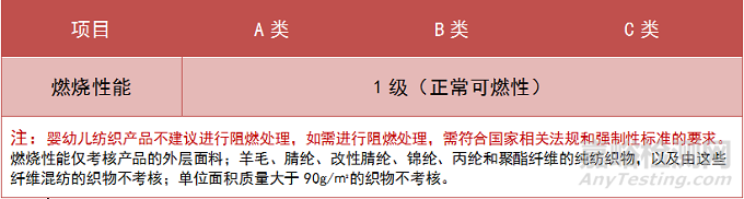 在標(biāo)準(zhǔn)GB 31701-2015《嬰幼兒及兒童紡織產(chǎn)品安全技術(shù)規(guī)范》中就有對童裝的燃燒性能的測試做了規(guī)定,按GB/T 14644-2014《紡織品 燃燒性能 45°方向 燃燒速率的測定》執(zhí)行,其內(nèi)在質(zhì)量要求為: