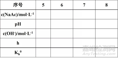 在50mL燒杯中,加入上述30mL溶液分別測(cè)定1-8號(hào)溶液的pH值并記錄(測(cè)定三次取平均值),計(jì)算解離常數(shù)、解離度、水解常數(shù)和水解度。