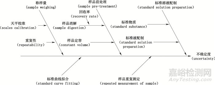 根據(jù)測(cè)定方法和數(shù)學(xué)模型,ICP-MS檢測(cè)重金屬及有害元素過(guò)程中的不確定度主要來(lái)源于5個(gè)方面:標(biāo)準(zhǔn)工作溶液的濃度、稱取固體樣品的質(zhì)量、標(biāo)準(zhǔn)曲線擬合、樣品前處理過(guò)程和測(cè)定過(guò)程中重現(xiàn)性所產(chǎn)生的不確定度[6]??捎敏~(yú)刺圖來(lái)表述不確定度的各分量來(lái)源,見(jiàn)圖 1。