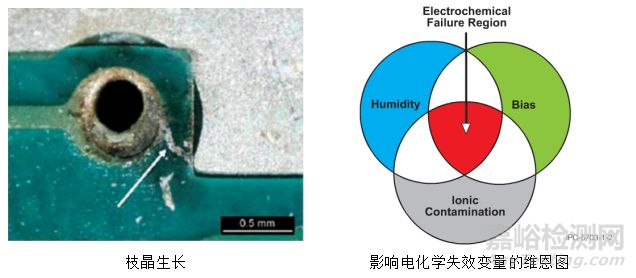 PCB(A)的可靠性工程里其中一個(gè)重要的部分就是電化學(xué)可靠性,其主要與組裝過程中的表面殘留有關(guān),而這些殘留有些是良性的,有些則是有害的。電化學(xué)失效機(jī)理也往往由離子殘留,電壓差,溫濕度三個(gè)要素構(gòu)成,當(dāng)三個(gè)要素達(dá)到一定的程度就會(huì)導(dǎo)致失效,往往造成產(chǎn)品漏電和電化學(xué)遷移(枝晶生長(zhǎng))。如下維恩圖很好的說明了三個(gè)因素的關(guān)系,其中每個(gè)因素所在的圈直徑越大,其對(duì)最終失效的影響程度就越高。