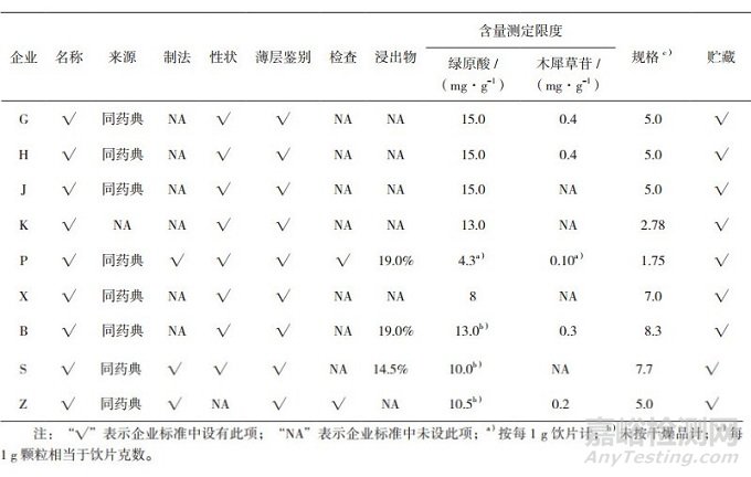 技術(shù)要求中規(guī)定, 中藥配方顆粒的質(zhì)量標(biāo)準(zhǔn)主要包括:名稱、來(lái)源、制法、性狀、鑒別、檢查、浸出物、指紋圖譜或特征圖譜、含量測(cè)定、規(guī)格、貯藏等。對(duì)比9家企業(yè)質(zhì)量標(biāo)準(zhǔn)可以看出:部分廠家【制法】【檢查】【浸出物】項(xiàng)缺失, 9家企業(yè)標(biāo)準(zhǔn)均未建立【指紋圖譜】或【特征圖譜】, 企業(yè)Z質(zhì)量標(biāo)準(zhǔn)中缺少【性狀】項(xiàng), 企業(yè)K質(zhì)量標(biāo)準(zhǔn)項(xiàng)下缺少【來(lái)源】項(xiàng); 另外, 《中國(guó)藥典》2015年版含量測(cè)定包含綠原酸和木犀草苷2個(gè)指標(biāo), 然而對(duì)比標(biāo)準(zhǔn)發(fā)現(xiàn), 企業(yè)J、K、X、S均未進(jìn)行木犀草苷的含量測(cè)定, 且各廠家含量測(cè)定限量要求差異大, 每1 g顆粒相當(dāng)?shù)乃幉?飲片)量不統(tǒng)一。