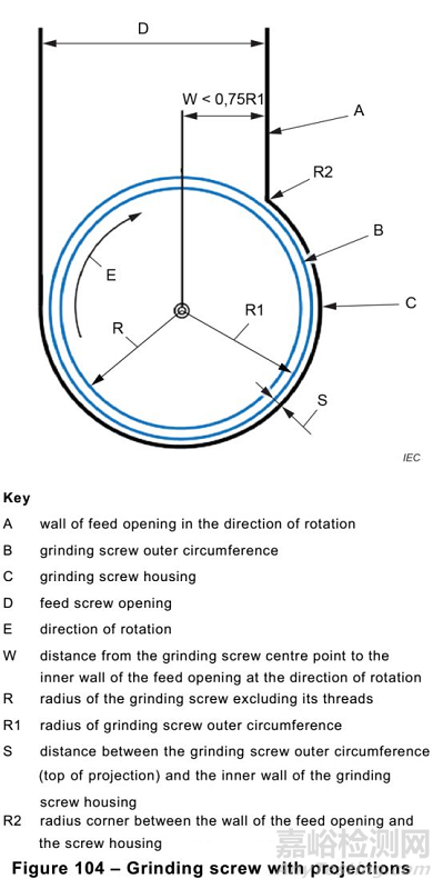 -進(jìn)料口與研磨方向相對(duì)的內(nèi)壁與螺桿中心點(diǎn)垂線的距離(見圖104中的W)應(yīng)不大于0.75倍的螺桿半徑(見圖104中的R1)。