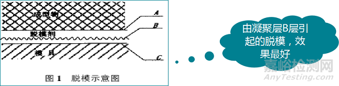 在模具表面噴涂脫模劑之后,硫化成型時的實際界面如圖1。在圖1中,膠料與脫模劑的接觸面為 A 面,脫模劑面為 B 面,脫模劑與模具的接觸面為 C 面;脫模劑層為凝聚層。脫模時,當在 A 面和 C 面剝離時稱為界面剝離,而在 B 面剝離時叫做凝聚層破壞。
