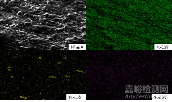 1)A樣品中,F(xiàn)、S元素分布均勻,說明A 樣中聚四氟乙烯和二硫化鉬的分布;而Si元素有局部不均勻,說明玻纖的分布不均勻,有較少量的的團聚現(xiàn)象。