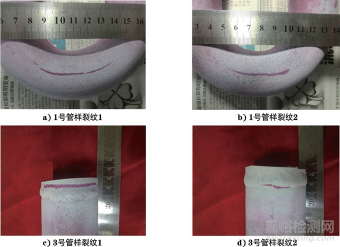 4根管樣滲透檢測結(jié)果表明,1號彎管兩側(cè)中性面處各存在一條縱向裂紋,其中一側(cè)中性面裂紋長約60mm,另一側(cè)中性面裂紋長約50mm;3號管樣焊接接頭處存在兩條環(huán)向裂紋,分別長約40mm和20mm;2號和4號管樣未發(fā)現(xiàn)缺陷顯示痕跡,滲透檢測顯示出的管樣缺陷形貌如圖2所示。