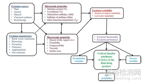 制劑廠家應(yīng)對(duì)輔料廠家進(jìn)行供應(yīng)商審計(jì),盡可能了解到輔料生產(chǎn)工藝、質(zhì)量控制等信息。有時(shí)需要結(jié)合制劑項(xiàng)目、輔料的生產(chǎn)工藝、過(guò)程控制等信息來(lái)制定輔料內(nèi)控質(zhì)量標(biāo)準(zhǔn)。根據(jù)下圖中提示的輔料對(duì)CQAs的影響,在處方工藝的開(kāi)發(fā)部分要關(guān)注來(lái)源、生產(chǎn)工藝、微觀性質(zhì)、宏觀性質(zhì)、批間差異等內(nèi)容。