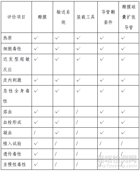 該產(chǎn)品包含括瓣膜、輸送系統(tǒng)、裝載工具、導(dǎo)管鞘套件和瓣膜球囊擴(kuò)張導(dǎo)管五個部分,其中瓣膜為植入器械,與循環(huán)血液長期接觸;輸送系統(tǒng)、導(dǎo)管鞘套件和瓣膜球囊擴(kuò)張導(dǎo)管為外部接入器械,與循環(huán)血液短期接觸。裝載工具與人體間接接觸。申請人按照GB/T 16886 系列標(biāo)準(zhǔn)對所有部件分別進(jìn)行了生物相容性評價,產(chǎn)品的生物相容性風(fēng)險可接受,具體評價項目詳見表3。