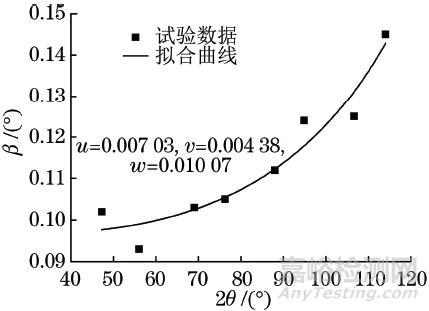 由于標(biāo)準(zhǔn)樣品與測(cè)試樣品不是同一種材料,得到的積分寬度不是在相同的衍射角,所以需要對(duì)標(biāo)準(zhǔn)樣品的積分寬度隨衍射角的變化進(jìn)行擬合,以便任何衍射角度都適用。通常采用下式進(jìn)行擬合