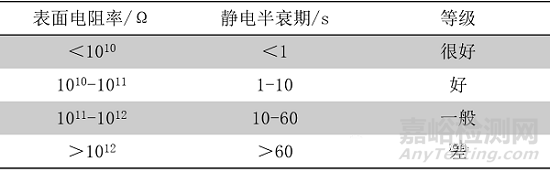 添加抗靜電劑的高分子材料的抗靜電性能是否符合要求,需要通過抗靜電性能來進行評估,目前評估抗靜電性能的參數(shù)主要有表面電阻(率),體積電阻(率)、靜電半衰期、吸濕性(接觸角) 、飽和靜電電壓等,其中表面電阻(率)及靜電半衰期是較常見的評估方法。表面電阻率是平行于通過材料表面上電流方向的電位梯度與表面單位寬度上的電流之比,是表示物體表面形成的使電荷移動或電流流動難易程度的物理量,其評估高分子材料的抗靜電性能與防靜電作用的機理是相對應的,這是一種簡易的定性的方法。而靜電半衰期是更詳細的定量評價方法,其方法一般是將高壓(1000-12000V)電壓加到高分子材料制品使之帶電后,用示波器觀察其電壓的衰減,以半衰期作為抗靜電效果的尺度。下表是依據(jù)靜電半衰期和表面電阻率來劃分的高分子材料抗靜電性能的等級,供參考。