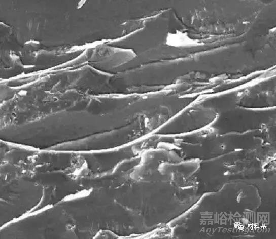 熱軋包鋁鎂板(軋制溫度400℃、壓下率45%)Mg側(cè)剝離面SEM形貌如圖3所示。由圖可清楚的觀察到在剝離面上存在大量撕裂棱、撕裂平臺(tái),在撕裂平臺(tái)上還存在許多放射狀小條紋和韌窩。