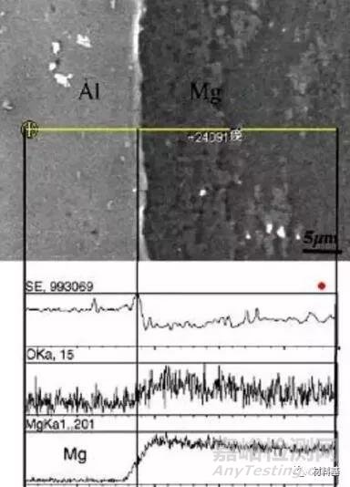 圖3是Mg/Al軋制復(fù)合界面的線(xiàn)掃描圖像,從圖中我們可以看到,穿過(guò)Mg和Al的界面進(jìn)行線(xiàn)掃描,可以得到,在Al的一側(cè),Mg含量低,在Mg一側(cè),Al幾乎為零;但在界面處,Mg和Al各大約占一半,說(shuō)明在界面處發(fā)生了擴(kuò)散,形成了Mg和Al的擴(kuò)散層。