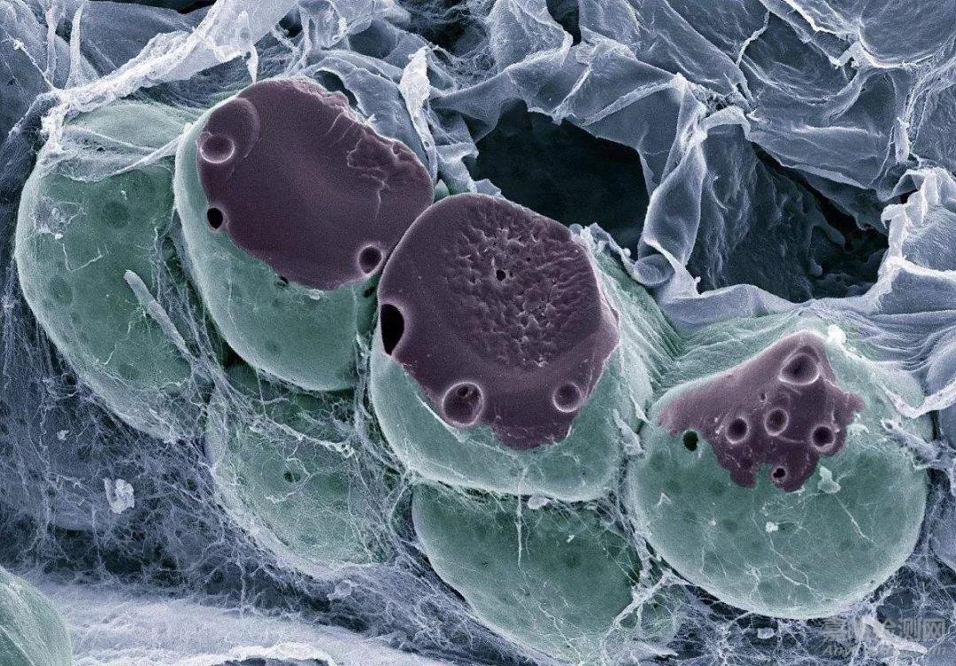 掃描電鏡(SEM)是介于透射電鏡和光學(xué)顯微鏡之間的一種微觀形貌觀察手段,可直接利用樣品表面材料的物質(zhì)性能進(jìn)行微觀成像。    電鏡掃描下的果蠅    掃描電鏡的優(yōu)點(diǎn)    ①有較高的放大倍數(shù),20-20萬(wàn)倍之間連續(xù)可調(diào);   ?、谟泻艽蟮木吧?,視野大,成像富有立體感,可直接觀察各種試樣凹凸不平表面的細(xì)微結(jié)構(gòu);   ?、墼嚇又苽浜?jiǎn)單。    電鏡掃描下的面包霉菌    影響掃描電鏡   ?。⊿EM)    的幾大要素    >>>>    分辨率    影響掃描電鏡的分辨本領(lǐng)的主要因素有:    A. 入射電子束束斑直徑:為掃描電鏡分辨本領(lǐng)的極限。一般,熱陰極電子槍的最小束斑直徑可縮小到6nm,場(chǎng)發(fā)射電子槍可使束斑直徑小于3nm。    B. 入射電子束在樣品中的擴(kuò)展效應(yīng):擴(kuò)散程度取決于入射束電子能量和樣品原子序數(shù)的高低。入射束能量越高,樣品原子序數(shù)越小,則電子束作用體積越大,產(chǎn)生信號(hào)的區(qū)域隨電子束的擴(kuò)散而增大,從而降低了分辨率。    C. 成像方式及所用的調(diào)制信號(hào):當(dāng)以二次電子為調(diào)制信號(hào)時(shí),由于其能量低(小于50 eV),平均自由程短(10~100 nm左右),只有在表層50~100 nm的深度范圍內(nèi)的二次電子才能逸出樣品表面, 發(fā)生散射次數(shù)很有限,基本未向側(cè)向擴(kuò)展,因此,二次電子像分辨率約等于束斑直徑。    當(dāng)以背散射電子為調(diào)制信號(hào)時(shí),由于背散射電子能量比較高,穿透能力強(qiáng),可從樣品中較深的區(qū)域逸出(約為有效作用深度的30%左右)。在此深度范圍,入射電子已有了相當(dāng)寬的側(cè)向擴(kuò)展,所以背散射電子像分辨率要比二次電子像低,一般在500~2000nm左右。    如果以吸收電子、X射線、陰極熒光、束感生電導(dǎo)或電位等作為調(diào)制信號(hào)的其他操作方式,由于信號(hào)來(lái)自整個(gè)電子束散射區(qū)域,所得掃描像的分辨率都比較低,一般在l000 nm或l0000nm以上不等。    電鏡掃描下的脂肪組織    >>>>    放大倍數(shù)    掃描電鏡的放大倍數(shù)可表示為M =Ac/As式中,Ac—熒光屏上圖像的邊長(zhǎng);As—電子束在樣品上的掃描振幅。一般地,Ac 是固定的(通常為100 mm),則可通過(guò)改變As 來(lái)改變放大倍數(shù)。    目前,大多數(shù)商品掃描電鏡放大倍數(shù)為20~20,000倍,介于光學(xué)顯微鏡和透射電鏡之間,即掃描電鏡彌補(bǔ)了光學(xué)顯微鏡和透射電鏡放大倍數(shù)的空擋。    >>>>    景 深    景深是指焦點(diǎn)前后的一個(gè)距離范圍,該范圍內(nèi)所有物點(diǎn)所成的圖像符合分辨率要求,可以成清晰的圖像;也即,景深是可以被看清的距離范圍。    掃描電子顯微鏡的景深比透射電子顯微鏡大10倍,比光學(xué)顯微鏡大幾百倍。由于圖像景深大,所得掃描電子像富有立體感。電子束的景深取決于臨界分辨本領(lǐng)d0和電子束入射半角αc。其中,臨界分辨本領(lǐng)與放大倍數(shù)有關(guān),因人眼的分辨本領(lǐng)約為0.2 mm, 放大后,要使人感覺(jué)物像清晰,必須使電子束的分辨率高于臨界分辨率d0 :電子束的入射角可通過(guò)改變光闌尺寸和工作距離來(lái)調(diào)整,用小尺寸的光闌和大的工作距離可獲得小的入射電子角。    >>>>    襯 度    襯度包括:表面形貌襯度和原子序數(shù)襯度。    表面形貌襯度由試樣表面的不平整性引起。    原子序數(shù)襯度指掃描電子束入射試祥時(shí)產(chǎn)生的背散射電子、吸收電子、X射線,對(duì)微區(qū)內(nèi)原子序數(shù)的差異相當(dāng)敏感。原子序數(shù)越大,圖像越亮。二次電子受原子序數(shù)的影響較小。高分子中各組分之間的平均原子序數(shù)差別不大;所以只有—些特殊的高分子多相體系才能利用這種襯度成像。