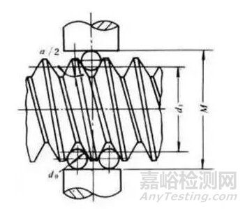 雙針測量法的用途比三針測量法還要廣泛,如螺紋圈數(shù)很少的螺紋,以及螺距大的螺紋(螺距大于6.5)都不便用三針量法測量,而用雙針量法測量則簡便可行,對于普通螺紋牙形角a=60º。