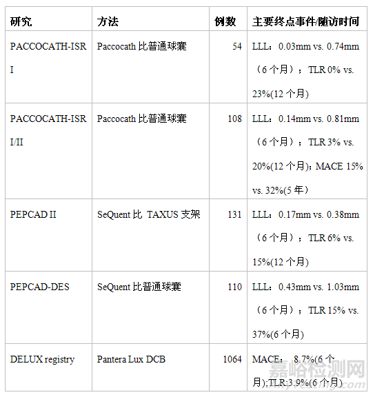 盡管PCI介入器材和介入技術迅猛發(fā)展,但再狹窄問題仍未被完全征服。單純經(jīng)皮冠狀動脈腔內(nèi)成形術(PTCA)再狹窄高達30%~60%,裸金屬支架(BMS)置入術后再狹窄可達30%,藥物洗脫支架(DES)置入術后再狹窄仍達5%~ 10%。近年來,藥物洗脫球囊(drug eluting ballon,DEB)或稱藥物涂層球囊(drug coated ballon,DCB)越來越多的得到關注。2004 年人類首個藥物球囊治療支架內(nèi)再狹窄的臨床研究(PACCOCATHISR Ⅰ)啟動,該研究及延長隨訪的PACCOCATH-ISR Ⅱ研究均報告紫杉醇藥物洗脫球囊與普通球囊相比,晚期管腔丟失顯著降低,支架內(nèi)再狹窄顯著減少,靶病變再次血運重建明顯降低,主要心血管事件(MACE,包括死亡、心肌梗死、TLR)顯著下降。2007年TCT年會發(fā)布了 PEPCAD Ⅰ和Ⅱ的臨床試驗結果。同年,前瞻性、隨機、多中心設計的 PEPCAD Ⅱ研究對比 SeQuent Please DCB(66 例)與紫杉醇洗脫支架(PES)再次置入(65例)處理裸金屬支架置入后再狹窄病變(BMS-ISR)的效果,6 個月后進行造影隨訪。結果顯示,DCB 組和 PES 組LLL(0.17±0.42)mm 比(0.38±0.61)mm,P=0.03, 提示DCB 處理 BMS-ISR 優(yōu)于PES?;诂F(xiàn)有的證據(jù)顯示,DCB 處理再狹窄獲得良好的療效,且DCB 還可用于血管直徑較小而不適合置入支架以及不能耐受或不適合長期口服雙聯(lián)抗血小板藥物的患者。(相關研究詳見下表)