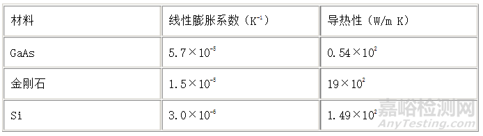 分析顯示,在金剛石子支架上早早就產(chǎn)生了裂紋,因?yàn)榻饎偸木€性膨脹與芯片中的GaAs的有很大差別。這樣就證實(shí)了金剛石是裂紋產(chǎn)生的主要因素。