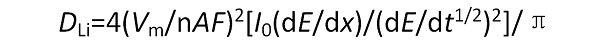 式中,i為電流值,t為時間,△Q為嵌入電極的電量,DLi為Li在電極中的擴散系數(shù),d為活性物質(zhì)的厚度。