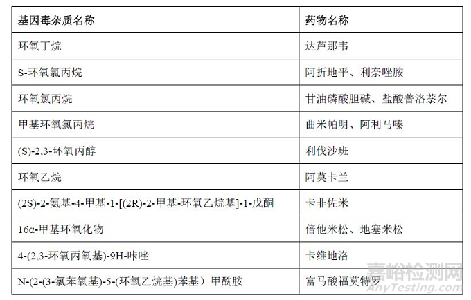 表1. 含有環(huán)氧化合物類基因毒雜質藥物列表